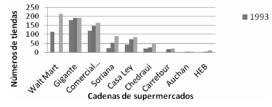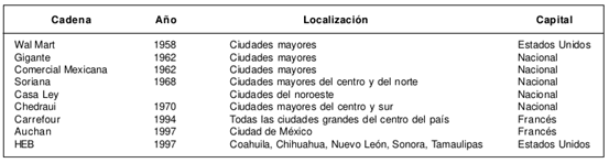 Los supermercados comenzaron a aparecer en 1958, cuando se abrió la primera tienda Aurrera, pero no fue sino hasta los años ochenta cuando se dio su expansión por todo el territorio. Anteriormente, solo las familias con ingresos muy altos acudían a los supermercados (USDA, 2002). Así, tales establecimientos se han expandido con un gran dinamismo pues entre 1993 y 1998 registraron una tasa anual de crecimiento del 18.2%, esto es, pasaron de 9 mil a casi 25 mil establecimientos en cinco años (Schwentesius & Gómez), siendo las principales cadenas de supermercados: Wal-Mart de México, Gigante, Comercial Mexicana, Soriana, Casa Ley y Chedraui (ver Tabla 2).