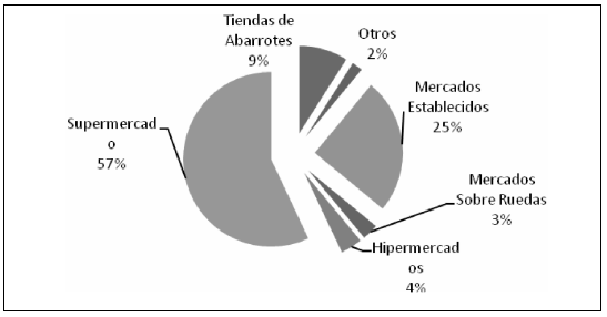 De acuerdo con el origen del capital, Schwentesius y Gómez muestran que las principales cadenas se nutren del capital estadounidense y evidencian, además, que las compras en supermercados son preferidas por encima de cualquier otro establecimiento, pues abarcan un 57% de las compras (Schwentesius et al).