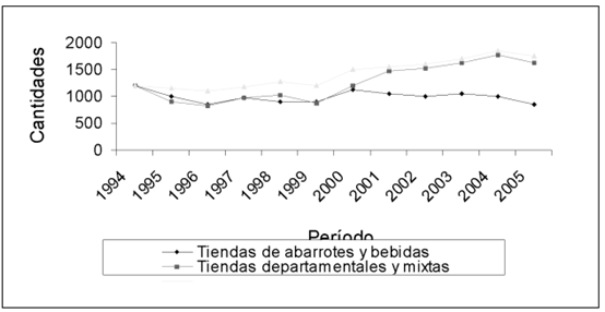 De acuerdo con esta información, el incremento en supermercados comenzó a despuntar desde 1999 y es claro que las ventas de supermercados y las tiendas departamentales están por encima de las ventas en tiendas de abarrotes, por lo que se puede comprobar que las compras en los nuevos canales de distribución como son los supermercados han aumentado significativamente y que las familias han acudido a comprar sus alimentos a estos lugares.