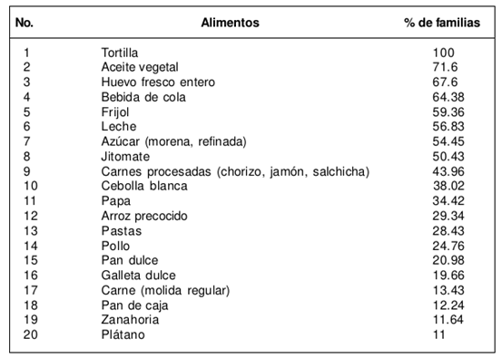 Alimentos que más consumen los hogares de Nuevo León. Para poder analizar donde compran sus alimentos los hogares, primeramente, se lativos, son quienes destinan más ingresos al debe identificar el patrón de consumo de las familias del Área Metropolitana de Monterrey, mismo que construyeron Ramos et al. (2005) y que se presentan en la Tabla 1. Muestra los 20 alimentos que más se consumieron en ésta región durante el año 2000, según la información del Diagnóstico Nutriológico de las Familias de Nuevo León, generado a partir de una encuesta directa aplicada por la Facultad de Salud Pública de Nutrición y la Universidad Autónoma de Nuevo León, sobre un total de 34 678 individuos distribuidos en 7 716 familias (Ramos et al., 2000) medido con la frecuencia modal, es decir, se tomaron los productos que más se consumen dentro de un hogar y se agruparon por distinto grupo de alimentos.