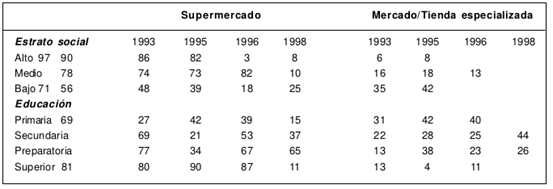 A pesar de que las compras en supermercados se han incrementado, las personas que acostumbran a comprar en estos lugares pertenecen al nivel socioeconómico medio y alto, en tanto las personas de menos ingresos optan por comprar sus alimentos en los mercados tradicionales y los tianguis (ver Tabla 3).