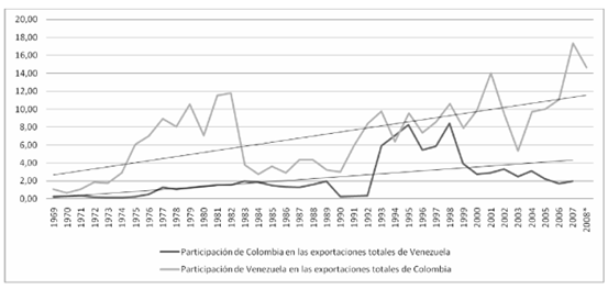 Esta tendencia al alza se mantuvo hasta 1999, en el que debido a la crisis colombiana las importaciones desde Venezuela se vieron drásticamente reducidas pasando de representar en 1998 un 8,41% de sus exportaciones totales a un 3,93% en 1999. Un caso similar tuvo las exportaciones colombianas hacia Venezuela, en menor medida. A partir del año 2000, las exportaciones colombianas hacia Venezuela han mostrado una fuerte tendencia alcista, mientras que la importancia de Colombia como socio comercial venezolano ha venido perdiendo importancia relativa, llegando a niveles cercanos a los presentados en los años ochenta (Véase Figura 1).