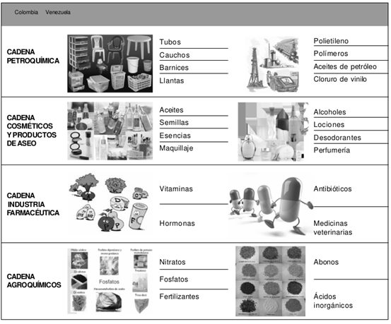 Los productos anteriormente mencionados se convierten en insumos básicos para la generación de bienes finales como los poliestirenos, tubos, mangueras, placas, resinas, pinturas, barnices, lacas colorantes, correas transportadoras, llantas, caucho industrial y otros; producidos por Colombia debido a que sus ventajas competitivas se han basado en estrategias industriales que han estado orientadas hacia el fortalecimiento del sector por medio de productos con valor agregado.