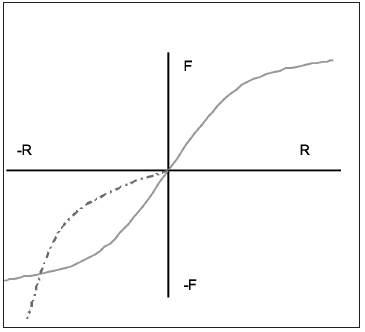 Kahneman y Tversky cambian la perspectiva y muestran que en el cuadrante positivo (FR) la relación es muy distinta a la del cuadrante negativo (-F-R). Cuando la persona pierde su riqueza y comienza a sentir la infelicidad, llega un momento en el que la pérdida de utilidad se acentúa de forma marginalmente creciente. De esta manera, se genera un círculo vicioso que se agudiza de manera exponencial. Claramente, para Kahneman y Tversky no hay simetría entre el placer y el dolor.