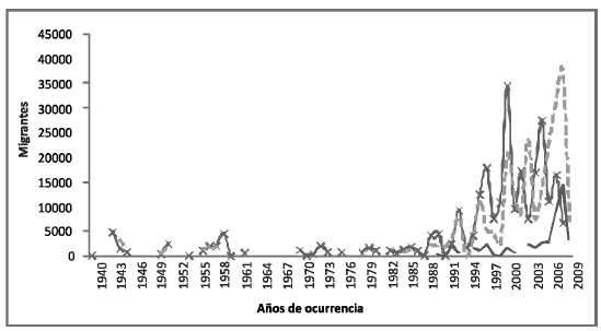 Las primeras migraciones, las últimas y los retornos, se pueden apreciar en la Figura 1. Esta muestra en la vertical el total ponderado de sujetos que emigraron y retornaron; se puede apreciar que entre los mexiquenses retornados se encuentran algunos que realizaron sus primeros viajes a EE.UU. durante la década de 1940 (línea remachada), pero también es visible que después de los años noventa, la migración internacional de nuevos migrantes (de primer viaje) se está incrementando. Igualmente resalta un pico sostenido de retornos a partir de los años noventa (línea punteada), evento que se corresponde con los años de despliegue de las políticas antiinmigrantes en EE.UU., las difíciles condiciones para encontrar empleo en aquel país y un poco al mejoramiento económico de México. El grueso de los retornados se observa realmente entre los años 2000-2009 con el 71% de ellos; de acuerdo al sexo, 85,74 y 71,90 por ciento de hombres y mujeres retornaron a la entidad en estos últimos años. La línea delgada sin remaches muestra que igualmente las últimas migraciones de los retornados, fueron desde los años noventa a la fecha; el reforzamiento en el cuidado fronterizo y el incremento en los costos y peligros al cruce de la frontera con EE.UU., han desmotivado la continuación de este proceso sobre todo entre los migrantes con experiencia. (Vease Figura 1).