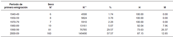 La salida de unos, la llegada o reinserción de otros, conforma nuevos paisajes y escenarios demográficos y económicos, que son diferentes al resto del país. Por ejemplo, los inmigrantes al Estado de México arriban de preferencia al área conurbada de la ciudad de México, y al sur del Estado; los primeros son de mayor calificación y especialmente en busca de empleos en las fábricas, los segundos vienen abrumadoramente a buscar empleos de jornaleros agrícolas a los campos florícolas, actividades en las que este Estado tiene los primeros lugares a nivel nacional. Los emigrantes en cambio, van hacia EE.UU. y Canadá; hacia EE.UU. inició en la zona sur del Estado desde antes del programa bracero, zona donde se concentra la población rural de mayor pobreza. Luego en los años ochenta, se incrementa notablemente y a partir de esa década no deja de crecer, según podemos apreciar en la Tabla 2. No obstante que en la entidad aún se aprecia una emigración proveniente de las regiones indígenas (mazahuas y otomíes), que tradicionalmente migraban dentro del país (Ciudad de México, Ciudad Juárez, Tijuana), y que a partir de los años noventa, han cambiado su destino hacia EE.UU. y Canadá (González, 2006). Hoy día, en esta entidad la migración hacia EE.UU. proviene en su mayoría de regiones urbanas que cuentan con amplia infraestructura, productiva y escolar: Nezahualcóyotl, La Paz, Chimalhuacán, Ecatepec, Naucalpan, Tlalnepantla, zona de Toluca (Metepec, Zinacantepec, San Mateo Atenco, Lerma, Almoloya de Juárez). Localidades consideradas como zonas emergentes de emigración internacional. Las dos últimas columnas de la tabla 2 muestran los porcentajes de población emigrante según la década y el sexo del sujeto.