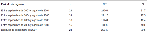 En este trabajo se considera como población de retorno, aquella que tiene 12 años o más, que afirmó haber ido a Estados Unidos a trabajar o buscar trabajo en cualquier momento de su vida y que ya se encuentran de regreso en su comunidad al momento de la entrevista3. De este modo, una primera estimación que tomó como base a quienes marcharon de la entidad y retornaron en los últimos cinco años, permite apreciar que alrededor de 49 mil personas en promedio podrían retornar cada año; es decir, menos de la mitad proyectada en estimaciones previas (Becerril, 2008). Con la información de campo mostrada en la Tabla 3, se puede afirmar que no hay elementos para temer en estos años la presencia de retornos masivos en la entidad mexiquense. Como se verá más adelante, los retornos implican la existencia de marchas previas y las condiciones económicas negativas que se presentan en Estados Unidos, el miedo a los cruces de la frontera, y las leves mejorías en la economía mexicana, están desmotivando también las emigraciones (Cave, 2011). Por otro lado, los retornos se relacionan con las condiciones socioeconómicas en ambos países; las condiciones para encontrar empleo son difíciles allá y acá.