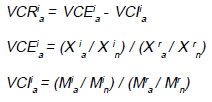 Donde X son exportaciones y M a importaciones. r se refiere al mundo, n a todas las mercancías, a al bien que se está analizando e i al país de estudio.