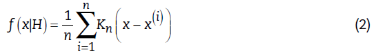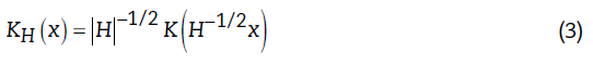 Donde: H es una matriz dxd, x un vector de d dimensiones, n el número de casos de aprendizaje, i el índice de casos en el conjunto de entrenamiento, y K n . es la función de kernel usada. Es importante observar que X es multivariable y que f x H es una función multivariable. El kernel es determinado por el promedio de n kernel K n . obtenido en cada observación x (i) . La función kernel se define a continuación:
