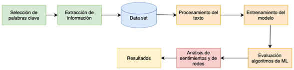 La metodología aplicada para llevar a cabo el análisis de sentimientos y la clasificación de comentarios en Twitter se resume en la Figura 1.