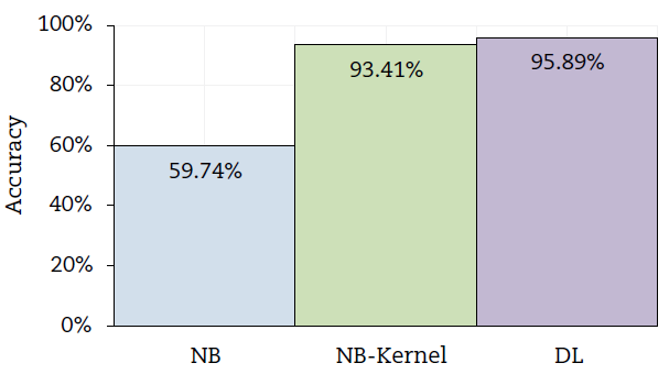 Se presentan los resultados del estudio, empezando por la evaluación de los modelos propuestos. En la Figura 2, se observa el desempeño de los tres algoritmos empleados (NB Kernel, NB y DL).