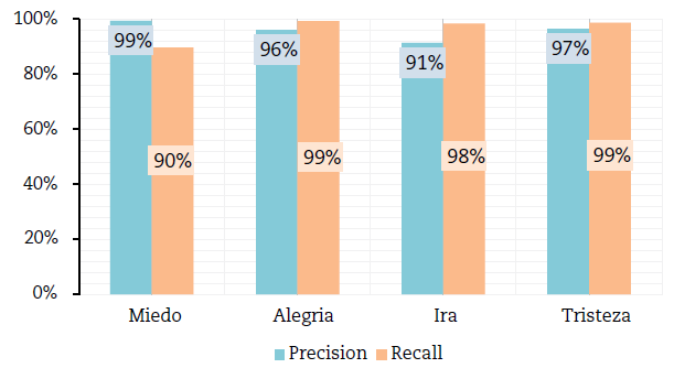 Como puede observarse en la Figura 2, de los tres algoritmos aplicados el que presenta un mejor rendimiento es Deep Learning (DL), con una precisión de clasificación del 95,89%. Por tanto, este fue el algoritmo seleccionado para clasificar los sentimientos en los comentarios extraídos de Twitter. Vale la pena señalar que la precisión de clasificación se encuentra dentro de los rangos apropiados para este tipo de modelos (Pang & Lee, 2008). A continuación, en la Figura 3 se muestra la precisión y la sensibilidad del modelo escogido para cada una de las categorías analizadas.