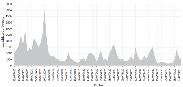 Como se indicó anteriormente, los comentarios de Twitter recopilados corresponden al periodo del 15 de mayo hasta el 31 de julio de 2020. En promedio, diariamente se observaron 930 tweets referentes al tema, con un mínimo de 158 y un máximo de 4.441 en un día, lo que indica una varianza considerable. La Tabla 2 presenta el resumen de los estadísticos descriptivos.