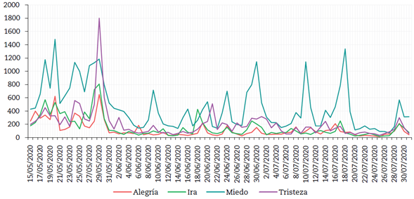 Como puede notarse, durante el mes de mayo el sentimiento predominante fue el miedo; sin embargo, con la ampliación de la cuarentena en la semana del 24 al 30 de mayo, la tristeza lo superó, brevemente, aunque de manera considerable frente a los demás sentimientos. Durante junio y julio, nuevamente, el miedo fue el sentimiento más importante en los comentarios; no obstante, disminuyó con respecto al mes de mayo. A continuación, en la Figura 6 se observa la distribución general de emociones en los datos analizados.