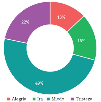Con el 49%, el sentimiento predominante de los usuarios de Twitter con respecto a la cuarentena fue el miedo, esto quiere decir que, del total de comentarios analizados, 35.614 expresan, como sentimiento principal, miedo. En segundo lugar, aparece la tristeza con 22% (15.766 comentarios); en tercer lugar, la ira con 16% (11.814 comentarios) y, finalmente, la alegría con solo un 13% (9.370 comentarios).