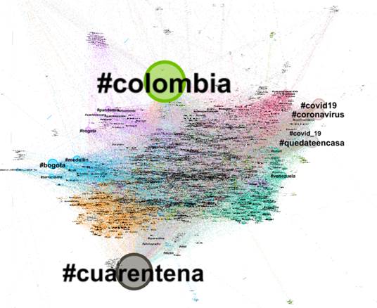 Los nodos que comparten el color azul señalan el uso de temas alusivos a distintas ciudades de Colombia, como Bogotá, Medellín, Barranquilla y Cali. El color verde oscuro (ubicado en la región inferior derecha) muestra la mención de otros países, como Venezuela, México, Chile y Ecuador.