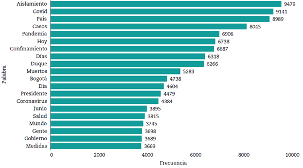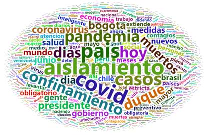 Además de identificar los temas que aparecen con mayor frecuencia, también se determinaron las palabras más utilizadas en los conjuntos de datos analizados. Para esto, se hizo uso de la nube de palabras. Nuevamente, el tamaño del término indica el nivel de frecuencia de la palabra en el cuerpo de texto procesado. En la Figura 8 se observan las palabras más frecuentemente empleadas en las 72.564 publicaciones de Twitter que se analizaron. Se destacan: “aislamiento”, “covid”, “país”, “confinamiento”, “casos”, “pandemia”, “hoy”, “Duque”, “días”, entre otras.
