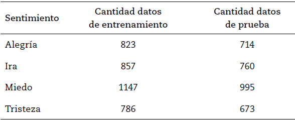 Para crear un modelo de clasificación de comentarios en función a los sentimientos, existen dos maneras documentadas en la literatura. Por un lado, se pueden utilizar los diccionarios, o lexicón, predefinidos que clasifican las palabras de los textos de acuerdo con el sentimiento que representan (Sauter et al., 2010). Otra manera de hacerlo, y que se considera más apropiada (Manning et al., 2008), es construir un algoritmo de aprendizaje de máquina que aprenda, a partir de conjuntos de datos de entrenamiento y de prueba, a reconocer los sentimientos y emociones en los textos. Para esta investigación se utilizó este último método, y se emplearon los conjuntos de datos de entrenamiento y testeo WASSA-2017 en su versión en español, creados por Mohammad y Bravo (2017). Este corpus de datos es extraído de Twitter con 6.755 comentarios (3.613 de entrenamiento y 3.142 de prueba), cada uno con una etiqueta de sentimiento asignada: alegría, ira, miedo y tristeza. En la Tabla 1 se presenta la distribución de emociones para el corpus empleado.