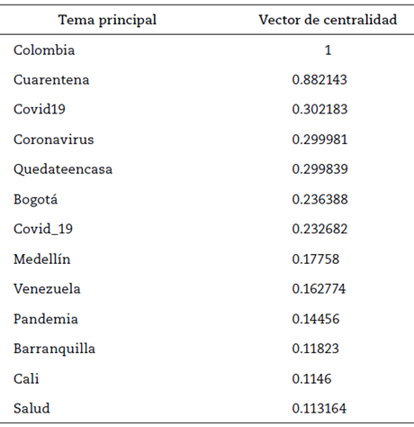 La centralidad como estadístico de opinión giró en torno a los temas “Colombia” y “cuarentena”; sin embargo, “coronavirus”, “COVID-19”, “quédate en casa” y “pandemia” también están altamente relacionados al confinamiento. En la Tabla 3 se presentan los 10 primeros términos más frecuentemente mencionados con numerales (#) en los comentarios de Twitter.