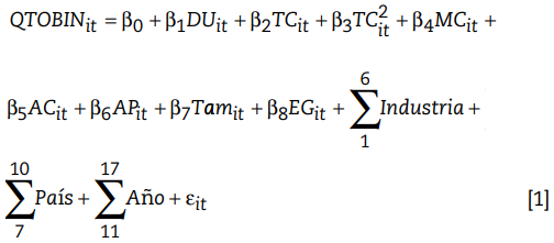 En el modelo, “i” representa a cada empresa, “t” cada periodo y “ε” el término de error. La variable utilizada como valor de la empresa es la Q de Tobin. Las variables independientes DU, TC, TC2, MC, AC están estrechamente relacionadas con el GC, y las variables de control AP, TAM y EG están estrechamente relacionadas con el valor de la empresa. Los coeficientes utilizados (β1, β2 … β8) permiten identificar el efecto de cada variable en la Q de Tobin.