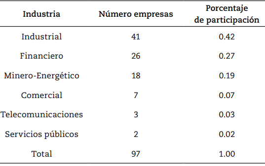 De las empresas consideradas, el 42 % (41 empresas) pertenecen al sector industrial, 27 % (26 empresas) pertenecen al sector financiero, 19 % (18 empresas) son del sector minero-energético, 7 % (7 empresas) pertenecen al sector comercial, 3 % (3 empresas) son del sector de telecomunicaciones y 2 % (2 empresas) corresponden al sector de servicios públicos. En la tabla 2 se detalla la estructura de la muestra por cada país y periodo considerado.