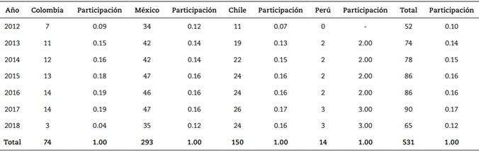 La composición de la muestra evidencia una mayor participación en el año 2017 que cuenta con 90 observaciones, lo que representa el 17 % del total de la muestra; siguen los años 2015 y 2016 con un 16 %, representados por 86 observaciones para cada país; luego viene el año 2014 con 78 observaciones, es decir, el 15 % de la muestra; el año 2013 equivale al 14 % de la muestra y cuenta con 74 observaciones; el año 2018, con un total de 65 empresas, representa el 12 % de la muestra; por último, el año 2012 cuenta con la participación de 52 empresas que representan el 10 % de la muestra. Por otra parte, la mayor participación está representada por las empresas mexicanas, a las que siguen las chilenas, colombianas y peruanas.