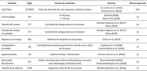 Por su parte, el tamaño del consejo se midió como la cantidad de personas que conforman los consejos directivos, debido a que, según Correa-Garcia et al. (2020) el número de integrantes que conforman las juntas tiene incidencia en el valor de la organización. También se tomó el tamaño del consejo al cuadrado. Esta variable fue asumida como la cantidad de consejeros que conforman las juntas directivas elevado al cuadrado. Autores como Lagos Cortés et al. (2017) y Zhou (2019) expresaron que las juntas directivas con mayor cantidad de consejeros pueden incidir negativamente en el valor de la empresa.