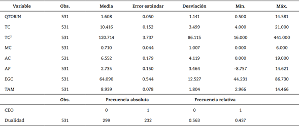 Este estudio consideró la dualidad del CEO como una doble funcionalidad del gerente. La dualidad fue tomada como una variable que adquiere el valor de cero cuando no hay dualidad, y el valor 1 cuando sí hay dualidad del CEO. Algunos autores como Kholeif (2008), Huy y Viet. (2020) y Freire et al. (2020) afirman que la dualidad del CEO tiene una incidencia negativa en el valor organizacional.