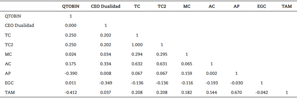 Luego de analizar las estadísticas descriptivas, se realiza un análisis bivariado que permite evaluar la interacción entre las variables de manera independiente, a través de la Q de Tobin. La tabla 5 presenta la matriz de correlación.