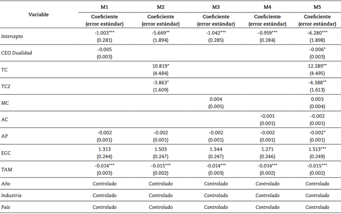 Con el fin de contrastar las hipótesis planteadas, la tabla 6 muestra el análisis multivariado que se realizó mediante la estimación de cinco modelos de regresión de panel de datos con las variables de GC y de control. En todos los modelos se conservaron las variables de control (AP, EG, TAM, Año, País, Industria).