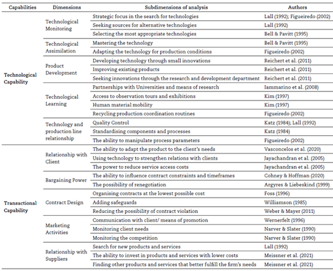 Studies on the capabilities of firms have defended the idea that for a firm to fill market gaps and achieve superior performance, over time, it must develop abilities both internally and externally, thus defining the firm´s boundaries (Gawer, 2020; Meissner et al., 2021; Kurkharskyy, 2020; Ulrich & Lake, 1991; Zawislak et al., 2012). These capabilities are responsible for differentiating a firm from its competitors (Teixeira et al., 2020). Vasconcelos et al. (2020) state that a firm’s competitive differential stems from the capabilities developed in its processes. In this sense, the firm needs the capabilities to “create” and “trade” products to satisfy market demands. For Tello-Gamarra (2013), the firm’s existence and boundaries abide, mainly, in two capabilities the firm develops. One capability is for creating and the other for trading in the market. That is to say, technological and transactional capabilities.