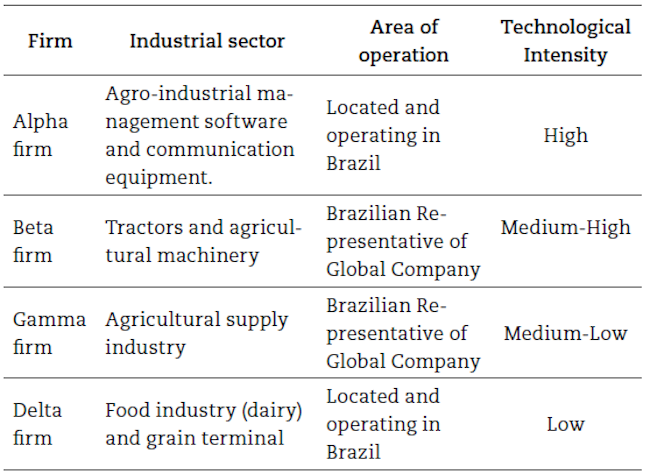 Case identification was conducted based on a sequence of criteria. In this case study, three criteria were established for the sample selection, as follows: (i) Being in a leadership position in their sectors; (ii) Being located in Brazil’s southernmost region; and (iii) Belonging to the four different technological intensity levels established by the OCDE (2003). Having defined these criteria, the firms were selected by convenience as long as they observed the three criteria. The four firms that were selected for this study fulfilled all the selection criteria.