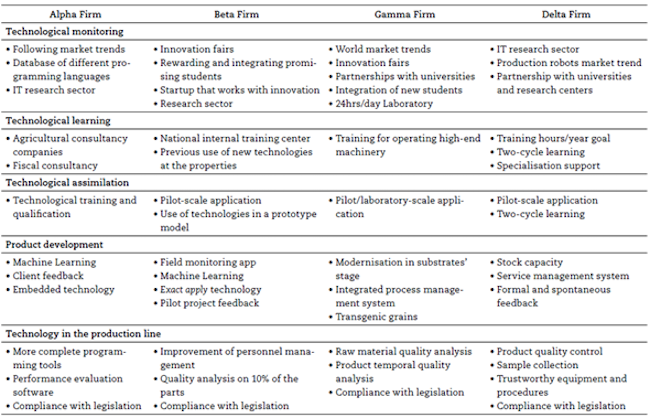 Technological learning. The four firms assert that the formalisation of a new process depends on labour specialisation. For example, Gamma firm emphasises this relevance in the statement: “We continue upgrading ourselves with technological innovations and also by getting involved a lot in research… certifying collaborators so that they can operate latest generation machinery with ease”. This process is directly linked to a learning routine, which complements the comprehension of this capability. Beta firm emphasises the importance of human material when they declare that “The company supports innovation fairs, giving students problems to solve and seeking out the ones who propose the best solutions”. Additionally, Delta firm affirms that they provide financial bonuses to their employees who fulfill the minimum annual training goals.