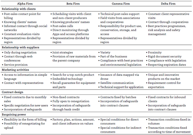 Marketing activities. This dimension is buttressed by the firms through their comprehension of the producer’s true needs. All the firms declared that they monitor client needs through strategically located representatives, due to the specificity of their services. Gamma firm set forth that “… with strategically placed professionals divided by area and by region, they are able to understand and establish a relationship with the producer, mapping a correlation of clients and potential clients”. With this, the strategies are created to fulfill the needs of each group of clients.