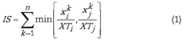 Este índice permite medir el grado de competencia existente entre dos países a partir de una comparación entre sus ofertas exportables. El IS oscila entre uno y cero, siendo uno que los países tienen una oferta exportable similar, por lo que el nivel de competencia entre ellos es alto, y cero en el caso opuesto (Gómez-Abella et al., 2013). La ecuación (1) describe el cálculo del índice.