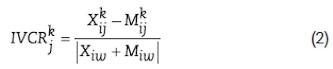 Donde Xkij son las exportaciones del producto k del país i (Colombia) al país j (Guatemala, Honduras y El Salvador), son las importaciones del producto k del país i (Colombia) desde el país j (Guatemala, Honduras y El Salvador), Xiw las exportaciones totales del país i al mundo y Miw las importaciones totales del país i desde el mundo.