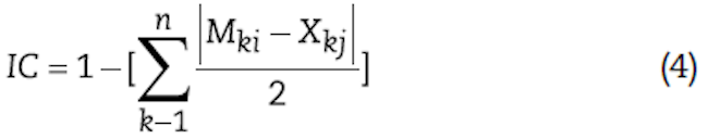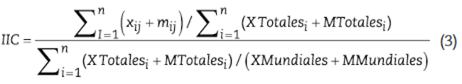 De acuerdo con Gómez-Abella et al. (2013) el IIC permite identificar si el intercambio comercial entre dos países es mayor o menor a lo esperado, dada su participación en el comercio internacional (ecuación 3).