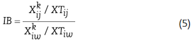 El IB mide la importancia de un producto en las exportaciones entre mercados en comparación con las exportaciones totales de ese producto. De esta manera, ofrece información acerca de los productos con mayores potencialidades para el intercambio entre países. Así pues, valores superiores a 0.3 en este índice son evidencia de productos con ventajas para ser transados (Gómez-Abella et al., 2013). El IB se define como lo señala la ecuación (5).