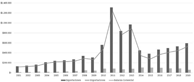 La Figura 1 permite apreciar que, si bien antes de la firma del TLC la balanza comercial era creciente y superavitaria para Colombia, es después del 2010 que las exportaciones nacionales hacia los países centroamericanos muestran un crecimiento significativo con respecto a años anteriores. Así pues, las exportaciones colombianas pasaron de USD 179,2 millones en 2009 a U573,5 millones en el 2011; sin embargo, en año 2014 el intercambio comercial sufrió un fuerte deterioro, con lo que los niveles retrocedieron a los valores previos a la firma del acuerdo comercial.
