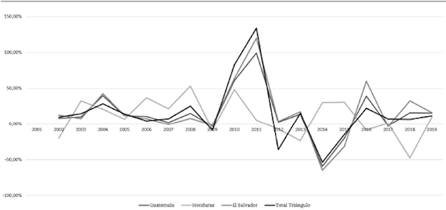 La Figura 2 presenta el análisis de las tasas de variación porcentual de las exportaciones de Colombia a cada uno de los países pertenecientes al Triángulo del Norte. Es a partir de esta figura que se puede señalar que, inmediatamente después de la firma del TLC, el socio comercial con el que crecieron en mayor proporción las exportaciones fue Honduras, con un crecimiento del 253.42 % en el 2010. En los dos años posteriores, la situación tuvo un cambio importante en la tendencia; por ejemplo, después de un crecimiento del 347.24 % en las exportaciones a El Salvador en el 2011, se presentó una caída del 85.06 % al año siguiente. A partir del 2015, las tasas de crecimiento han sufrido fuertes fluctuaciones con valores que van desde una caída del 20.06 % en las exportaciones hacia Guatemala en el 2015 hasta un aumento del 40.14 % en las exportaciones hacia Honduras en el 2017.