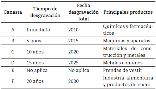 Al observar con mayor detenimiento la composición por sectores productivos en las canastas de desgravación, se destaca que aproximadamente el 80 % de los productos corresponde a manufacturas, siendo el restante 20 % productos agrícolas y agroindustriales. Dentro de las manufacturas los subsectores que cuentan con mayor número de productos son el de la industria química y el de las máquinas y aparatos, que además están dentro de las canastas A y B, las cuales ya cuentan con desgravación total y representan cerca del 25 % del total de partidas arancelarias negociadas.