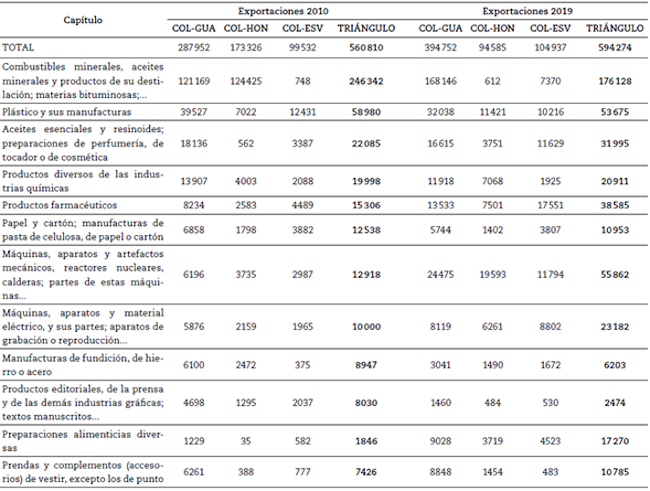 Ahora bien, al examinar el comportamiento de la balanza comercial a nivel producto, es posible evidenciar una mejora en los volúmenes de exportación de productos tales como: máquinas, aparatos y artefactos mecánicos que, pasaron de representar el 2.30 % de las exportaciones totales al Triángulo del Norte en el 2010, a representar un 9.40 % en el 2019; y productos farmacéuticos cuya participación pasó del 2.73 % al 6.49 %, en los mismos años respectivamente. Dentro de los productos que perdieron participación en las exportaciones el caso más significativo es el de combustibles, que al inicio de la década equivalía al 43.93 % de las exportaciones colombianas, y para el 2019 había caído a casi la mitad con una participación del 29.64 %. La Tabla 2 describe el comportamiento de los diez productos con mayores volúmenes de exportación entre los dos socios comerciales en análisis.