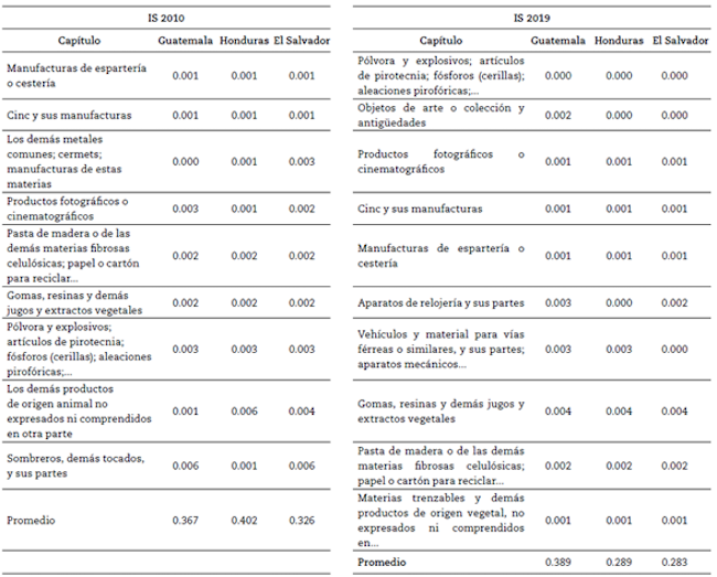 Donde xki son las exportaciones del producto k del país i (Colombia), xkj las exportaciones del producto k del país j (Guatemala, Honduras y El Salvador) y XTi y XTj son las exportaciones totales de los países i y j, respectivamente. La Tabla 3 presenta las estimaciones del IS para el comercio con los tres países del Triángulo del Norte. Como se observa, el promedio del IS se ha mantenido estable y sin cambios significativos desde la firma del Acuerdo (2010) y el último año con información disponible (2018). El promedio del IS revela que el nivel de competencia entre países es bajo, siendo el de mayor nivel con Guatemala. Ahora bien, el análisis por producto prueba pocos cambios en los bienes entre el inicio del Acuerdo y la actualidad; no obstante, en el 2019 fue posible identificar un mayor número de productos con potencialidades (IS < 0.005) que en el 2010.
