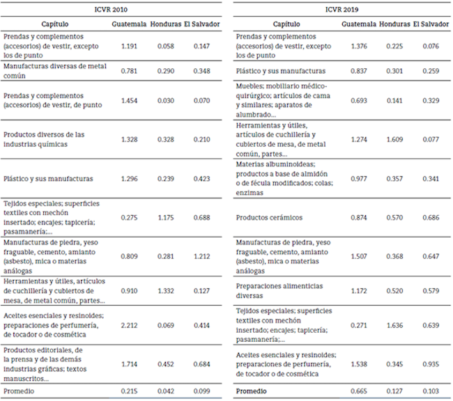 El IVCR se utiliza para identificar las ventajas o desventajas de las transacciones comerciales entre países. En ese ordende ideas, toma valores positivos y negativos, siendo los positivos aquellos en los que el país manifiesta una ventaja de cara al comercio internacional (Durán & Álvarez, 2008). La Tabla 4 presenta los productos con los valores más altos del IVCR y el valor promedio del IVCR que, para el caso de los tres países es positivo, pero bastante bajo; y de forma particular para Guatemala, pues decreció entre el 2010 y el 2019 (ecuación 2)