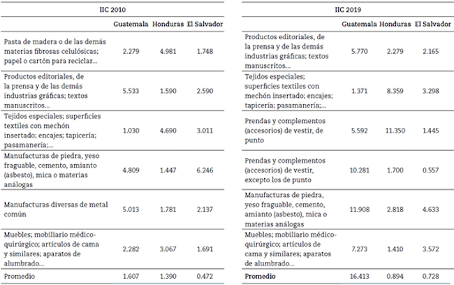 En definitiva, de las seis subpartidas arancelarias identificadas con mejor desempeño del IIC en los países centroamericanos, solamente Honduras presenta un comportamiento alejado de uno. Lo anterior gracias a su industria maquiladora, que hace que importe desde otros países y asimismo exporte. Los productos con mayor intensidad comercial para exportar a estos países son las prendas de vestir de punto con un IIC promedio de 6.1 y las manufacturas de piedra con IIC de 6.4, seguidos de los tejidos especiales (4.3) y prendas de vestir que no son de punto (4.2).