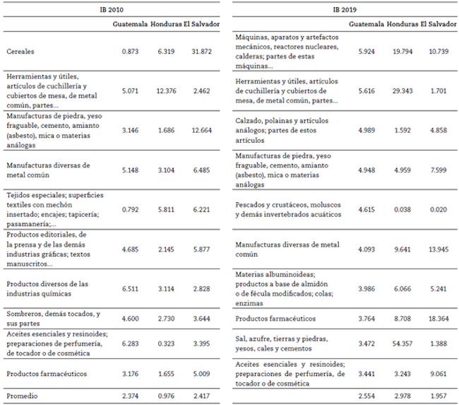 La Tabla 7 evidencia los productos que para los años 2010 y 2019 registraron los mayores IB, por ende, aquellos productos con mayor potencialidad para el comercio entre Colombia y los países pertenecientes al Triángulo del Norte.