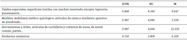 Los productos en los que Colombia tiene mayores ventajas se asocian con la producción de prendas de vestir, plástico, muebles, manufacturas, entre otros. En contraste, productos como gomas y resinas; bebidas, líquidos alcohólicos y vinagre; y pastas de madera mostraron IVCR negativos.