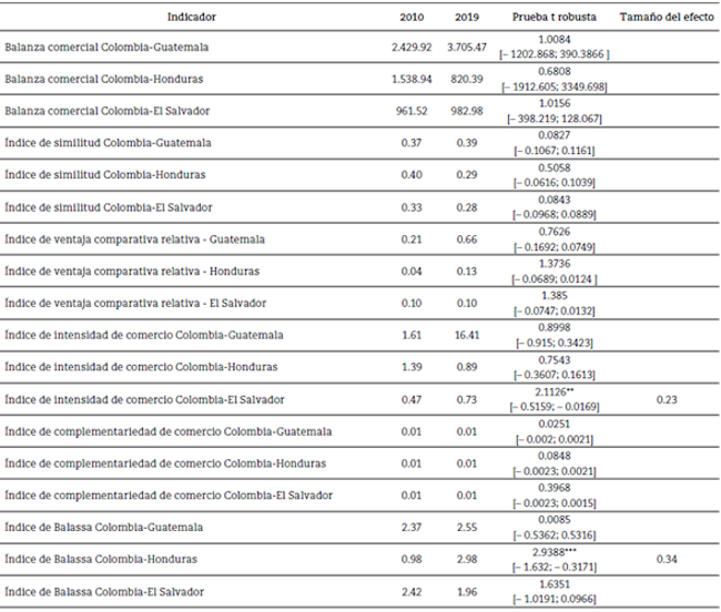 Para analizar las potencialidades de crecimiento del intercambio comercial, diversificación de la canasta exportable e incremento de los beneficios derivados del aprovechamiento del TLC Colombia-Triángulo del Norte, se estimaron cinco indicadores de comercio internacional y política comercial, a saber: IS, IVCR, IIC, ICC e IB (Gómez-Abella et al., 2013).