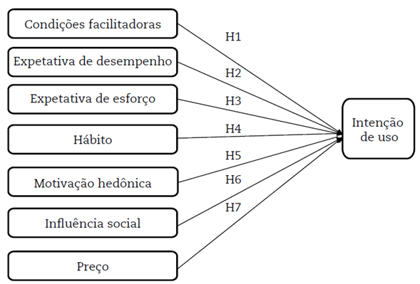 Para a mensuração dos construtos, aplicaram-se escalas de sete pontos (1 - discordo totalmente, 2 - discordo em grande parte, 3 - discordo, 4 - neutro, 5 - concordo, 6 - concordo em grande parte e 7 - concordo totalmente), de modo a garantir a sustentação do modelo teórico da pesquisa constituído por condições facilitadoras, expectativa de desempenho, expectativa de esforço, influência social, motivação hedônica, preço e hábito.