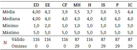 As estatísticas descritivas foram obtidas pelo software SPSS. As perguntas do questionário foram elaboradas concatenando-as ao seu respectivo construto de modo a facilitar a sua interpretação, como apresentado na Tabela 1.